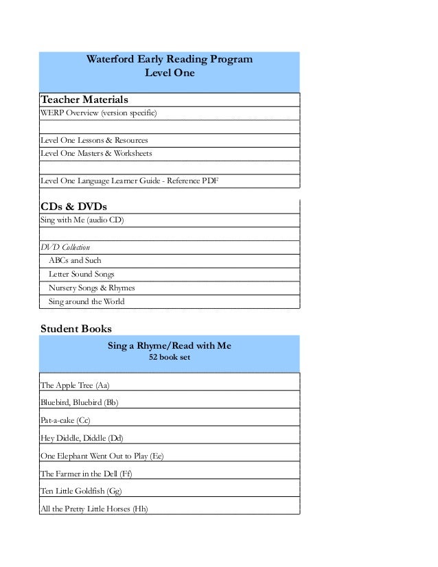 Kindergarten waterford level 1 emergent reading 100 first grade waterford level 2 beginning reading 99. Waterford early reading program level 1 level 2 level 3 correlation results by level. Waterford early reading program level one mother mother i am ill ii jack and jill jj three little kittens kk mary had a little lamb ll little miss muffet mm i touch my nose like this nn polly put the kettle on oo this little pig pp quack quack quack qq little rabbit rr eensy.